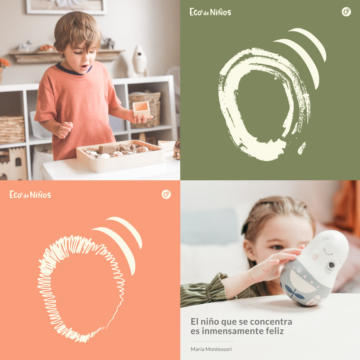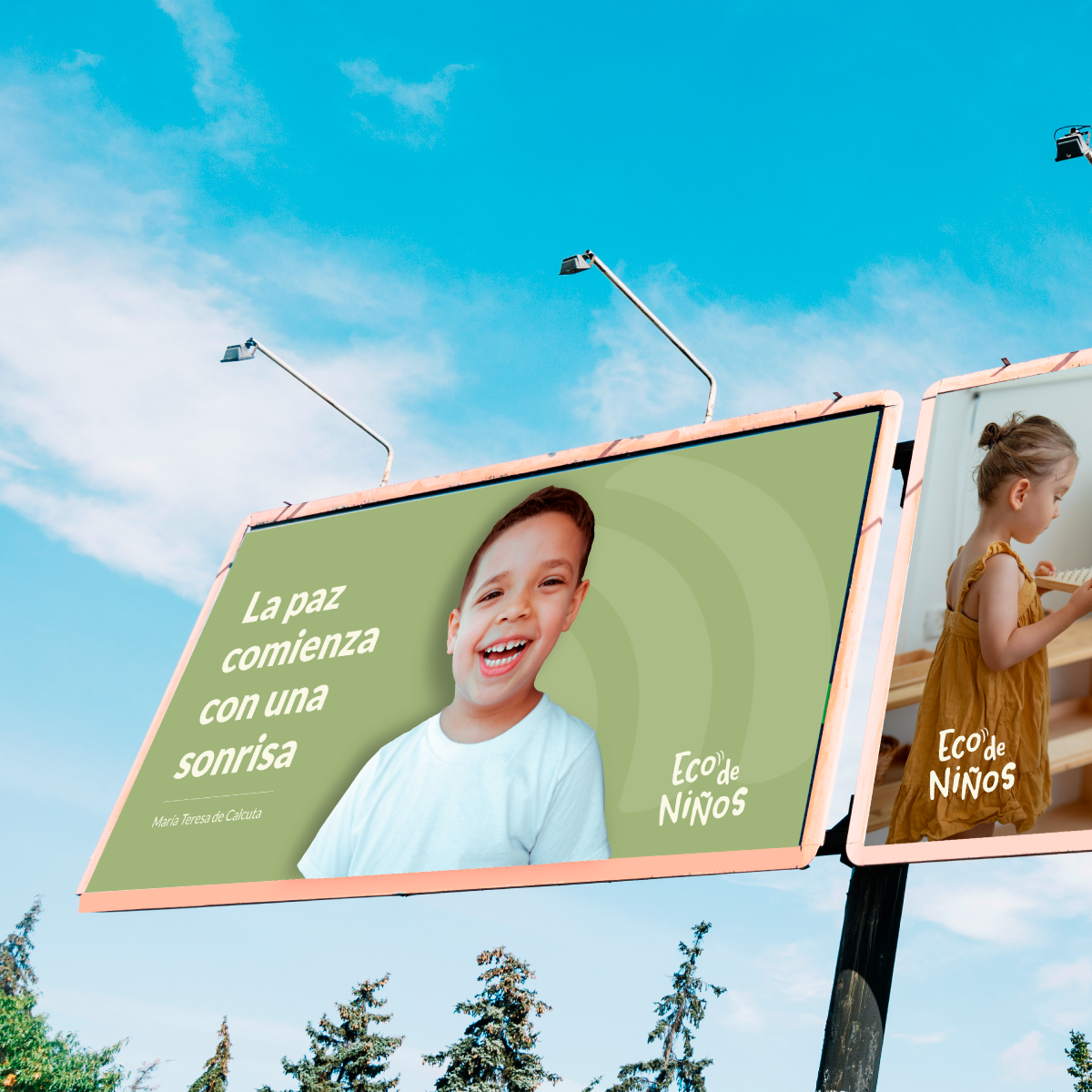Eco de niños es un espacio donde se desarrolla la educacion Montesorri. El cliente queria un logo y un isotipo que sea facil de recordar y que a la vez se pueda jugar con el en distintas actividades para los niños.